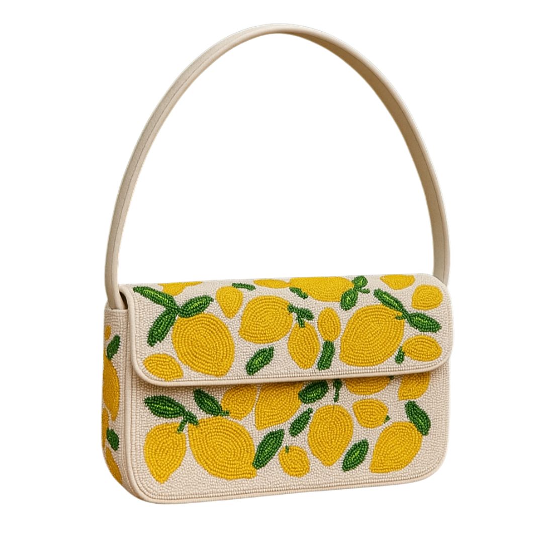 Hand-beaded with intricate lemon patterns, designed to evoke a fruit theme with modern elegance