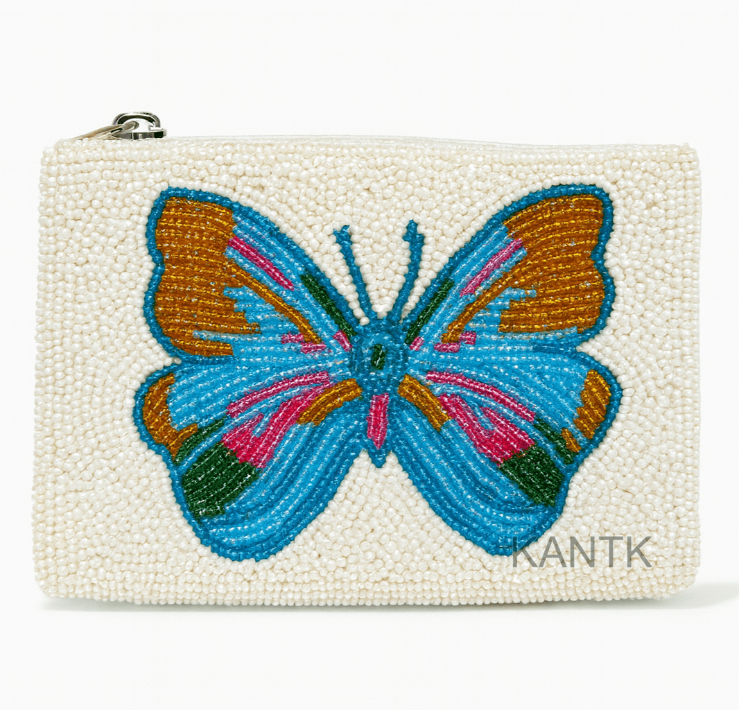 This elegant white beaded pouch showcases a stunning, colorful butterfly design at its center, crafted with intricate beadwork that adds texture and depth. The delicate combination of shimmering white beads and vibrant hues creates a captivating contrast, making it both stylish and eye-catching. Perfect for storing small essentials, it combines artistry with functionality, making it an ideal accessory or thoughtful gift.